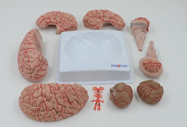 This extremely realistic life size brain model can be divided into 9 parts showing the temporal and occipital lobes, the frontal and parietal lobes, the cerebellum, the brain stem and the basilar artery. All structures, including blood vessels, are shown in great detail